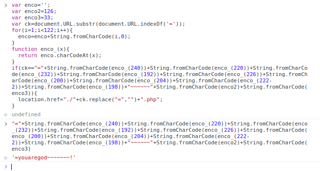 if(ck=="="+String.fromCharCode(enco_(240))+String.fromCharCode(enco_(220))+String.fromCharCode(enco_(232))+String.fromCharCode(enco_(192))+String.fromCharCode(enco_(226))+String.fromCharCode(enco_(200))+String.fromCharCode(enco_(204))+String.fromCharCode(enco_(222-2))+String.fromCharCode(enco_(198))+"~~~~~~"+String.fromCharCode(enco2)+String.fromCharCode(enco3)){