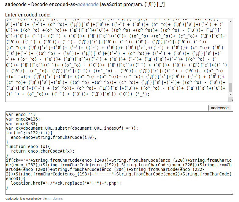 aadecode - Decode encoded-as-aaencode JavaScript program. (゚Д゚) ['_'] Enter ...