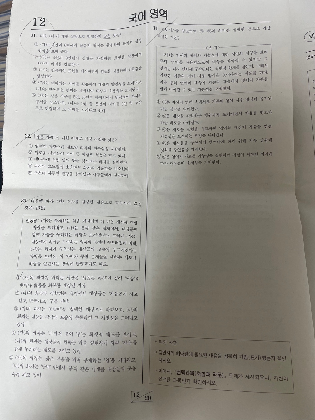 문학 마지막 지문에서 제대로 해석 못하고 내맘대로 읽어버려서 4문제중에 3개 틀림