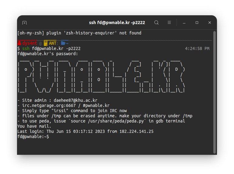 ssh fd@pwnable.kr -p2222 명령어를 쉘에 입력하고 비번 guest를 치면 pwnable.kr에 fd계정으로 SSH 연결이 된다.