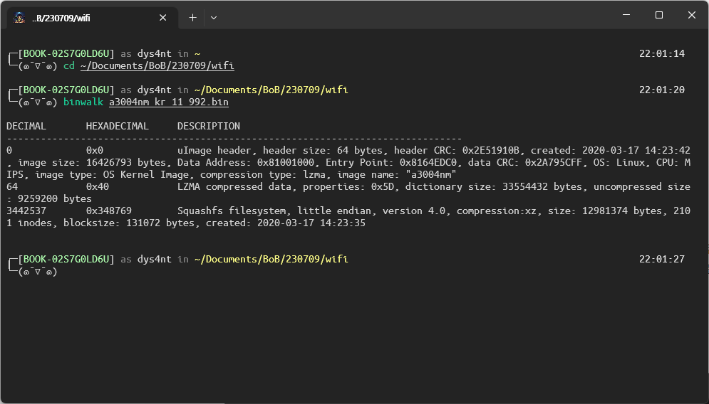 펌웨어를 다운받고 binwalk 명령을 통해서 펌웨어의 구조를 살펴보았다.