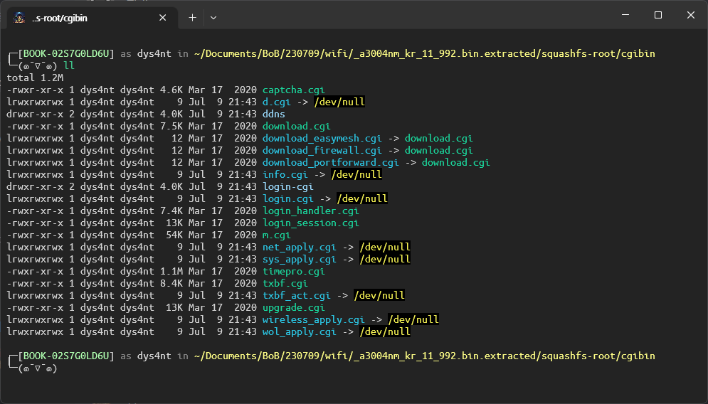 여기서 ipTIME 공유기에 접속하면 .cgi 확장자로 된 url 링크에 접속하는 것을 확인할 수 있는데, 이로써 /cgibin 디렉토리에 중요한 파일들이 모여있을 것으로 추측하였다.