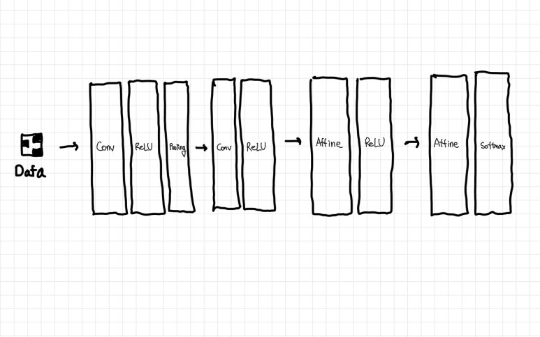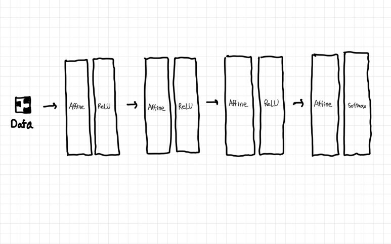 각 층마다 Affine계층과 ReLU 활성함수가 존재해서 데이터를 처리하고, 마지막 층에서는 Softmax함수로 최종결과를 출력한다.
