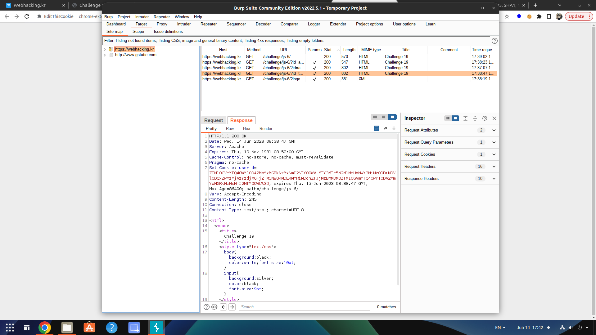 userid cookie가 설정됨을 알 수 있고, 뒤에 =가 붙어있어 base64형식임을 유추할 수 있다.