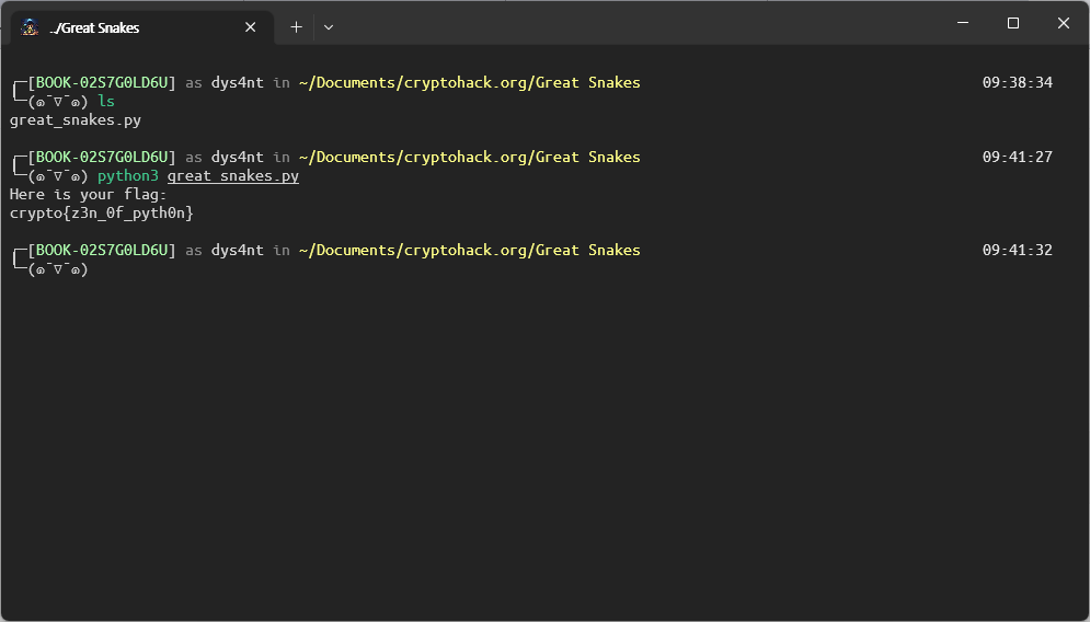 great_snakes.py라는 파일이 주어지는데, wget을 이용해서 파일을 받은 다음 실행하면 플래그가 나온다.