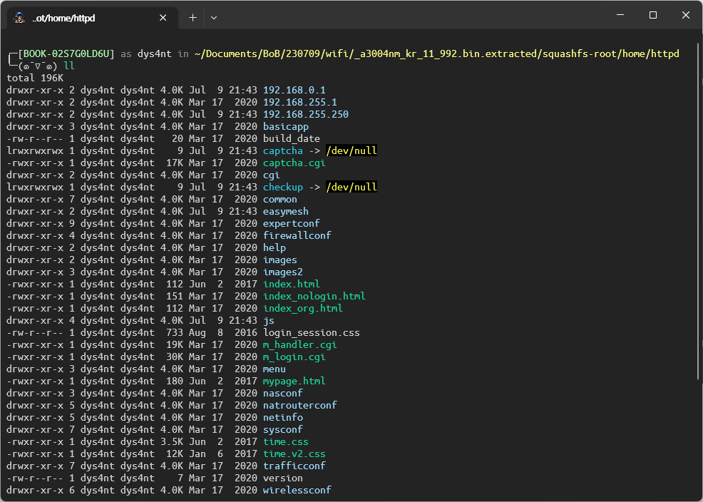 여기서 ipTIME 공유기에 접속하면 .cgi 확장자로 된 url 링크에 접속하는 것을 확인할 수 있는데, 이로써 /cgibin 디렉토리에 중요한 파일들이 모여있을 것으로 추측하였다.