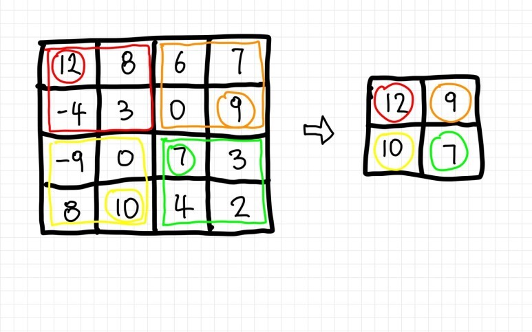 예를 들어서 4 x 4 행렬에 대해서 2 x 2 맥스 풀링 (Stride 값을 2로 둔다)를 시행하면 다음과 같이 나타난다.